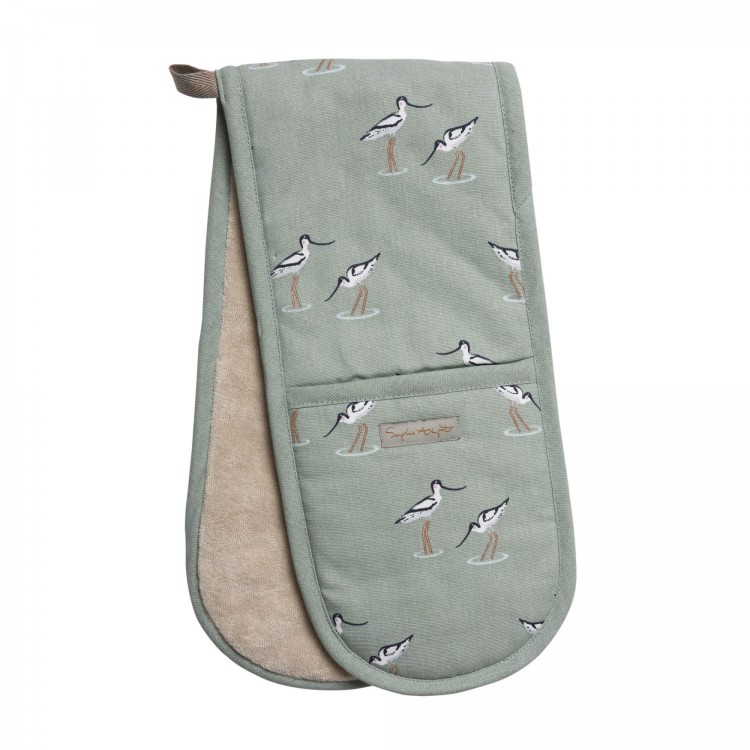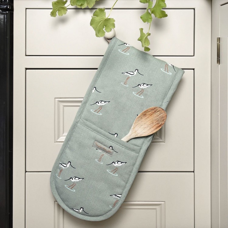 Protect your hands from hot pans with this charming pair of heat resistant double oven gloves in Sophie Allport's Coastal Birds design, decorated with avocets, the British wading bird with curving bill and long legs disappearing into rippled grey-green water.