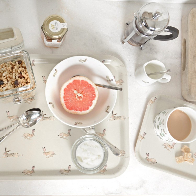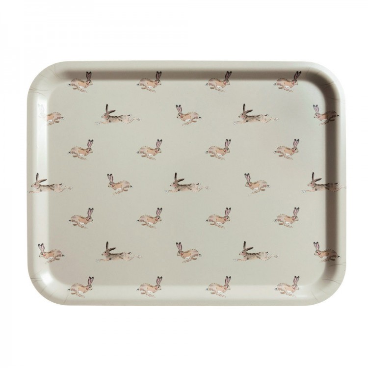 Handmade from strong and food safe birch wood, this gorgeous tray features racing hares on a neutral stone coloured background.