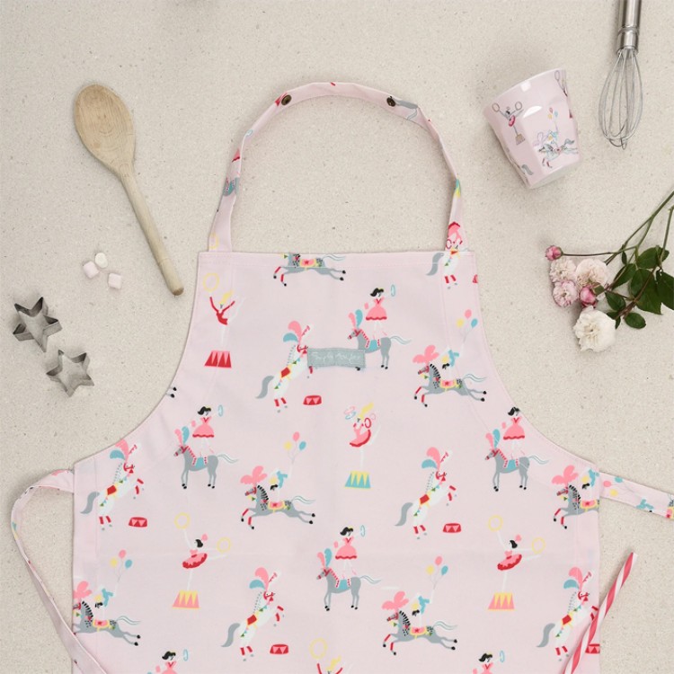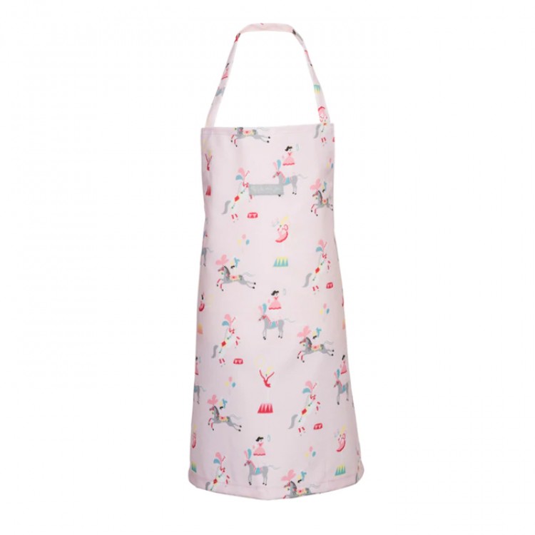 This wipe-clean children's apron will keep clothes safe from paint, baking mess and pens! Sophie's cute and bright design features colourful fairground ponies and circus performers on a pastel pink background.